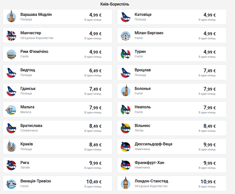 Наибольшее количество предложений по дешевым авиабилетам - из аэропорта "Борисполь". Масса рейсов осуществляется в Польшу: в Варшаву, Катовице можно улететь по цене от 4,99 евро, в Быдгощ - от 6,49 евро, во Вроцлав - от 7,49 евро, в Краков - от 8,49 евро.