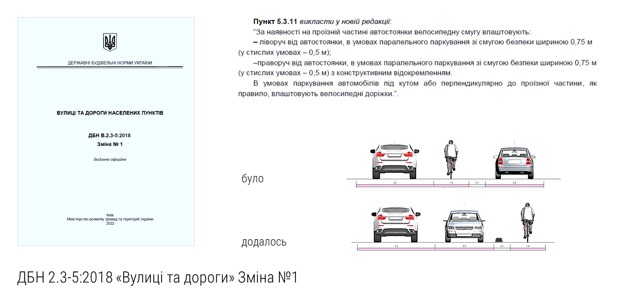 Соответствующее изменение в ГСН В.2.3-5:2018 "Улицы и дороги населенных пунктов" принял Минрегион. Согласно нему, с 1 сентября официально ввели конструктивное отделение велосипедных полос за полосой автомобильной парковки. Это должно помочь в борьбе с автохамами, которые часто паркуются на велодорожках, не соблюдая ПДД.