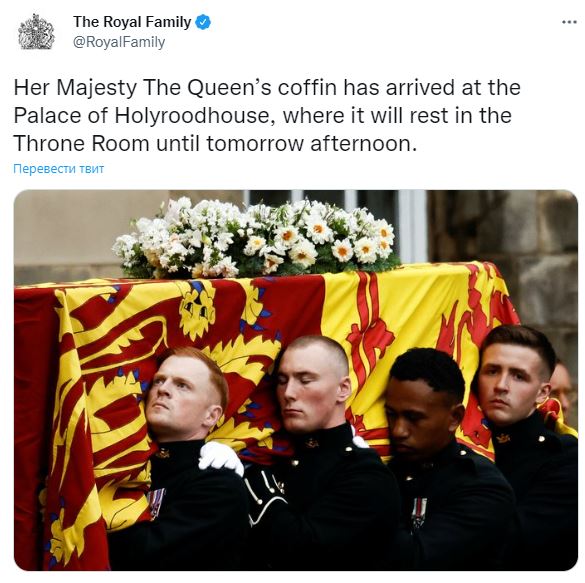В Холирудском дворце тело монарха пробудет сутки. 13 сентября дочь королевы принцесса Анна сопроводит гроб с телом Елизаветы II на авиабазу Королевских ВВС Нортхолт, а оттуда - в Букингемский дворец.