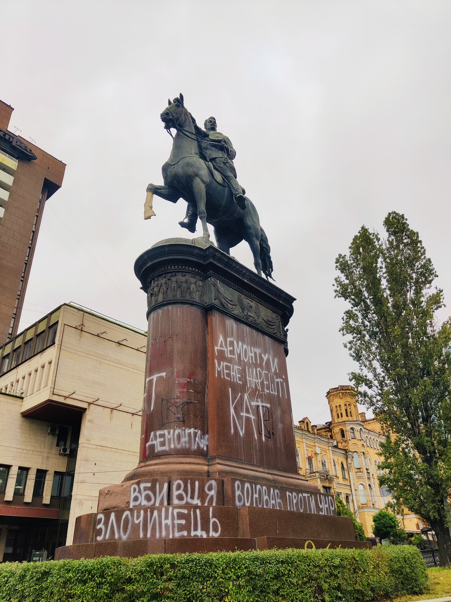 Так они раскрасили памятник Николаю Щорсу, который находится на бульваре Тараса Шевченко. Активисты отмечают, что фигура военного командира большевиков четко подпадает под Закон о декоммунизации. Его должны были убрать еще в 2016 году, когда Украинский институт национальной памяти сделал первые призывы убрать монумент из сердца столицы.