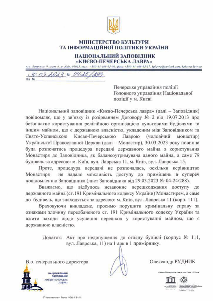 Также исполняющий директора Лаврского заповедника написал заявление в полицию с просьбой поспособствовать устранению препятствий по использованию заповедником имущества монастыря.