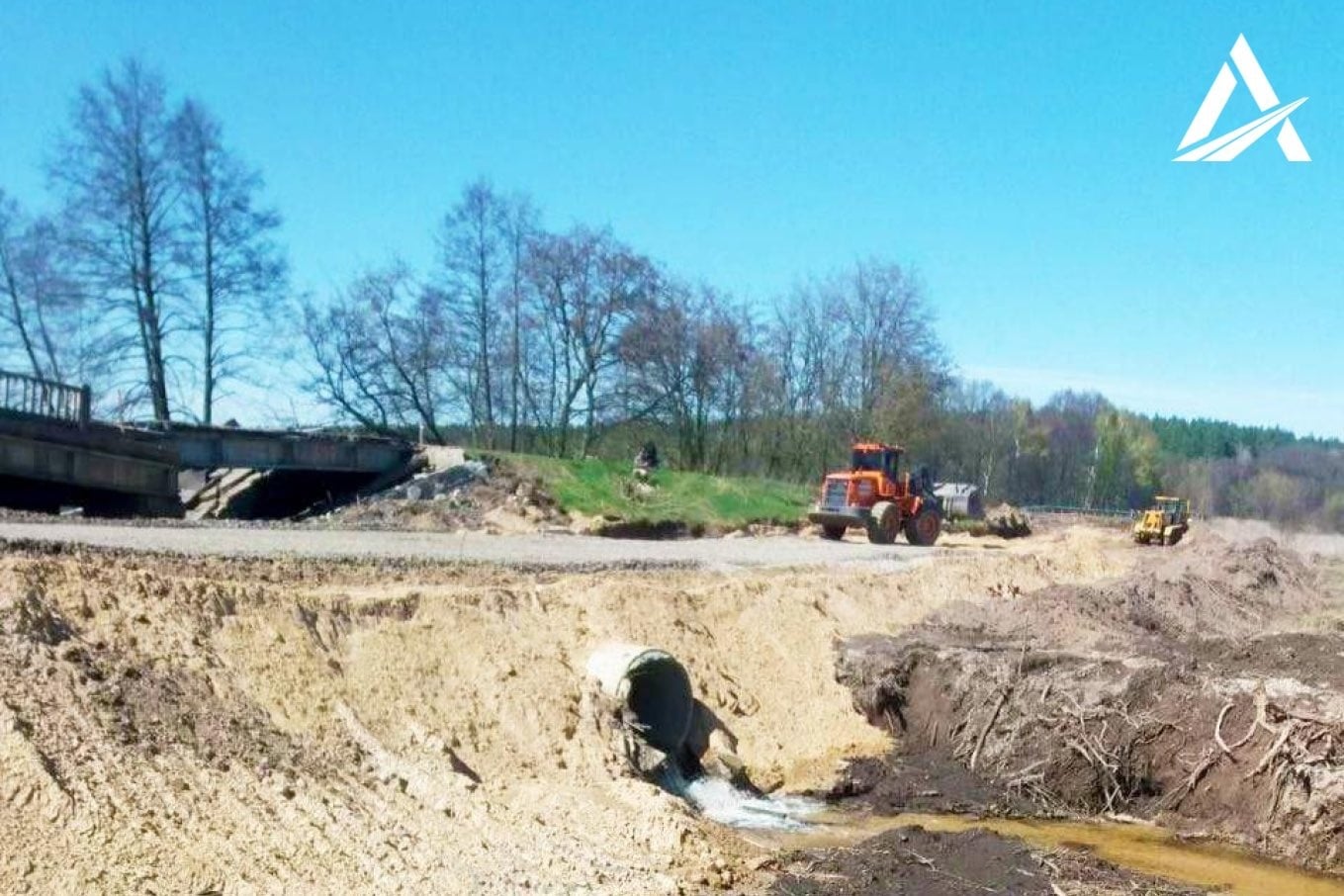 По его словам, 4 мая было открыто движение по насыпному мосту из бута и щебеночно-песчаной смеси через реку Тетерев. Для безопасного проезда по краю моста установили бетонные блоки.