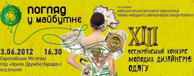3 июня 2012 в Киеве состоится финал 13-го Всеукраинского конкурса молодых дизайнеров одежды "Взгляд в будущее". Именно Конкурс "Взгляд в будущее" был стартовой площадкой для уже известных украинских модельеров, среди которых Елена Буренина, Андре Тан, Наталья Каменская, Олеся Кононова, Артем Климчук, Елена Пржонской, Ксения Марченко, Александр Каневский, Эдуард Насыров, Виктория Заграфова, Маша Рева ...