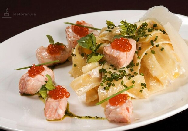 Домашняя паста со сливочным соусом, розовыми ломтиками лосося, красной икрой и душистым базиликом (250 г – 95 грн.) скрасит серый пейзаж за окном и утопит во вкусовой неге.