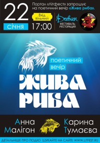 22 января в 17:00, в фестиваль ресторации "Диван" литературный портал "литфест" (www.litfest.ru) организует очередные чтения. На этот раз приглашаем на поэтический вечер под названием "Живая рыба", где вы сможете услышать творчество двух прекрасных и самобытных рыбок, поеток-двухтысячников - Анны Малигон и Карины Тумаев.