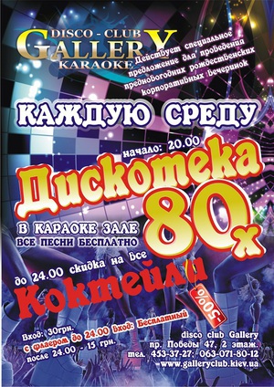 Мы дарим Вам уникальную возможность вновь оказаться в ритмах незабываемой юности. Для Вас звучат хиты монстров советской и зарубежной эстрады на все времена. Море хорошего настроения, Конкурсы, призы и подарки! Fire - шоу! Два зала удовольствия поможет вам запомнить эту ночь надолго! У Вас есть возможность петь любимые песни в караоке зале всю ночь, и конечно, танцы до утра под любимую музыку эпохи 80х!