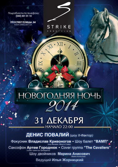 Незабываемую праздничную атмосферу для Вас будут создавать: Денис Повалий (участник Х-Фактор, Украина має Талант), саксофонист - Артем Голоднюк (Лауреат международных конкурсов, солист президенского оркестра Украины), шоу балет "ВАМП", шоу двойников Марина Анисович (Ирина Аллегрова), кавер группа "The Cavaliers", фокусник - Владислав Кривоногов (шоу Феномен, Минута Славы), ведущий - Илья Жорницкий и DJ Zorg. Входной билет дает Вам доступ в 4 зоны развлечения: Дискотека, Караоке, Паб, Боулинг. Приходите в Strike и загадаем вместе желания под бой курантов!