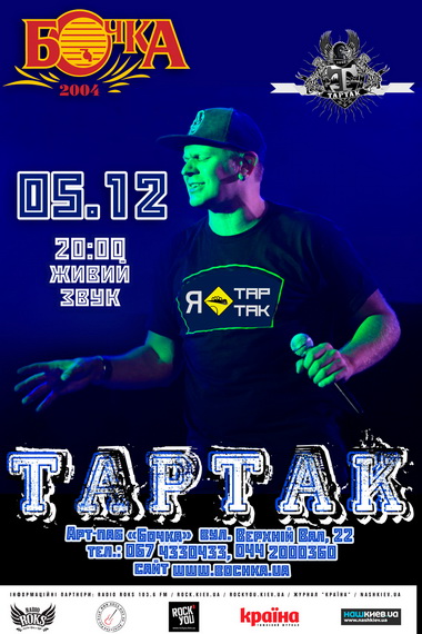 У арт-паба "Бочка" особое, трепетное, отношение к группе "Тартак" и ее поклонникам! Именно с концерта группы Олександра Положинского началась история нашего паба, и мы рады, что на его открытии выступил "Тартак"!