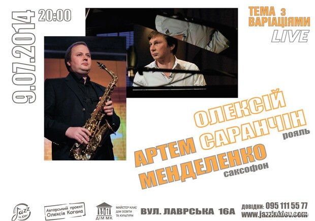 В рамках авторского проекта Алексея Когана "Тема с вариациями. Live" выступит дуэт украинских музыкантов: Артем Менделенко (саксофон) и Алексей Саранчин (рояль).