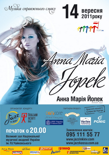 14 сентября 2011 в 20:00 в Киеве в Большом зале Национальной музыкальной академии Украины им. П.И. Чайковского (Консерватория) в рамках серии "Музика справжнього смаку" состоится концерт знаменитой польской джазовой и поп-певицы Анны Марии Йопек (Anna Maria Jopek).