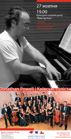 27 октября в Культурно-образовательном центре "Мастер Класс" состоится концерт НКА "Киевские солисты" и известного пианиста Джонатана Пауэлла (Jonathan Powell), Великобритания.