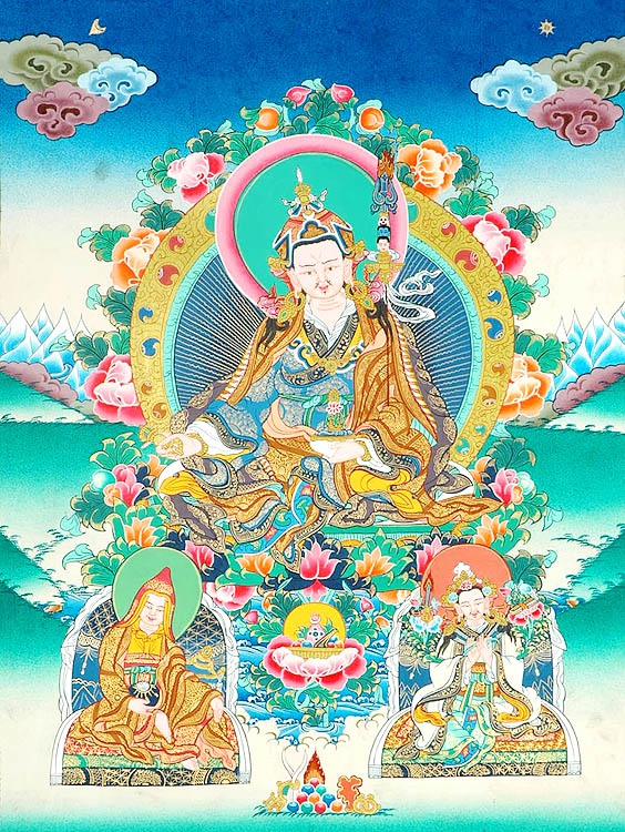 *Падмасамбхава, Гуру Ринпоче - легендарный йогин-чудотворец, который принес в Тибет буддийское учение в 8 веке. Падмасамбхава также передал тибетцам учение дзогчен, одно из высших учений буддизма. Гуру Ринпоче является очень важным персонажем во всех тибетских направлениях буддизма, особенно в старой традиции - Ньингма. Как божество практики, Гуру Ринпоче является эссенцией всех мирных и гневных божеств, и обозначает чистое состояние реализации. Гуру Ринпоче был непобедимым покорителем духов и демонов, также считается, что он постиг и реализовал все возможности, которые таит природа ума, поэтому медитация на образ Гуру Ринпоче и повторение его мантры способствуют раскрытию Традиции тибетского буддизма и обретению духовной защиты. Буддийское божество, такое как Гуру Ринпоче, не имеет собственной сущности, это символ просветленного состояния, чистый и пустотный, это матрица раскрывающая такое состояние в человеке.