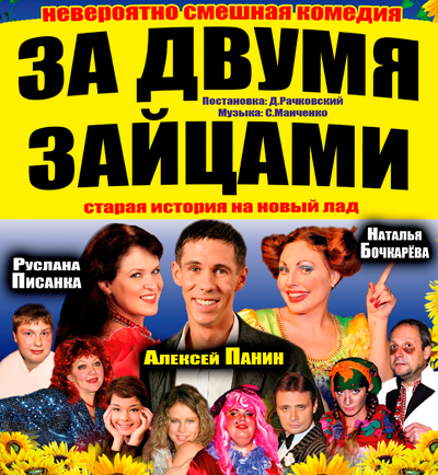 В постановке "За двумя зайцами", которую киевские театралы смогут посмотреть 23 октября 2012 года, роль харизматичной Прони исполнит неподражаемая актриса Руслана Писанка, легко очаровывающая и вызывающая овации одним только своим появлением на сцене. Прощелыгу Голохвастого сыграет популярный российский актёр театра и кино Алексей Панин, а Галю – Наталья Бочкарёва. Приходите в Театр оперетты, чтобы лично оценить отличнейший актерский состав, талантливо воплощённый украинский быт, красочные декорации, весёлые песни и танцы – все составные компоненты этого замечательного спектакля, превращающие разворачивающееся на сцене действо в поистине великолепную феерию.