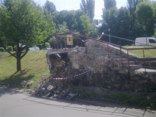 Ливень, который прошел сегодня утром, размыл фрагмент подпорной стенки ступенек по адресу 40-летия Октября 124 в Голосеевском районе.