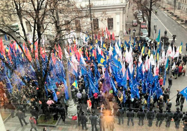 Сейчас в центре проходит одновременно несколько митингов: одна акция проходит на Бессарабке, также около полутысячи активистов в данный момент идут от Европейской площади к Верховной Раде.