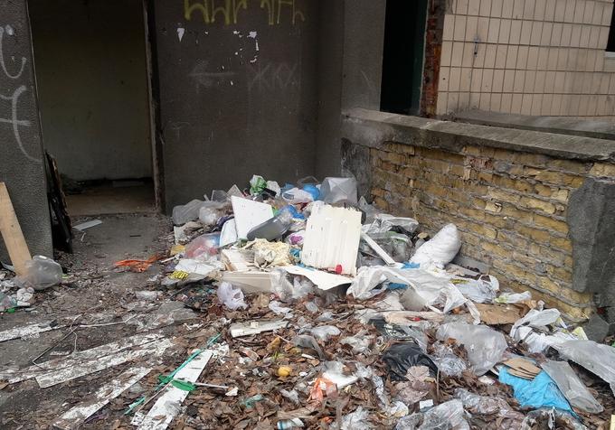 Горы мусоры, разбитые окна и использованные шприцы разбросаны по территории.