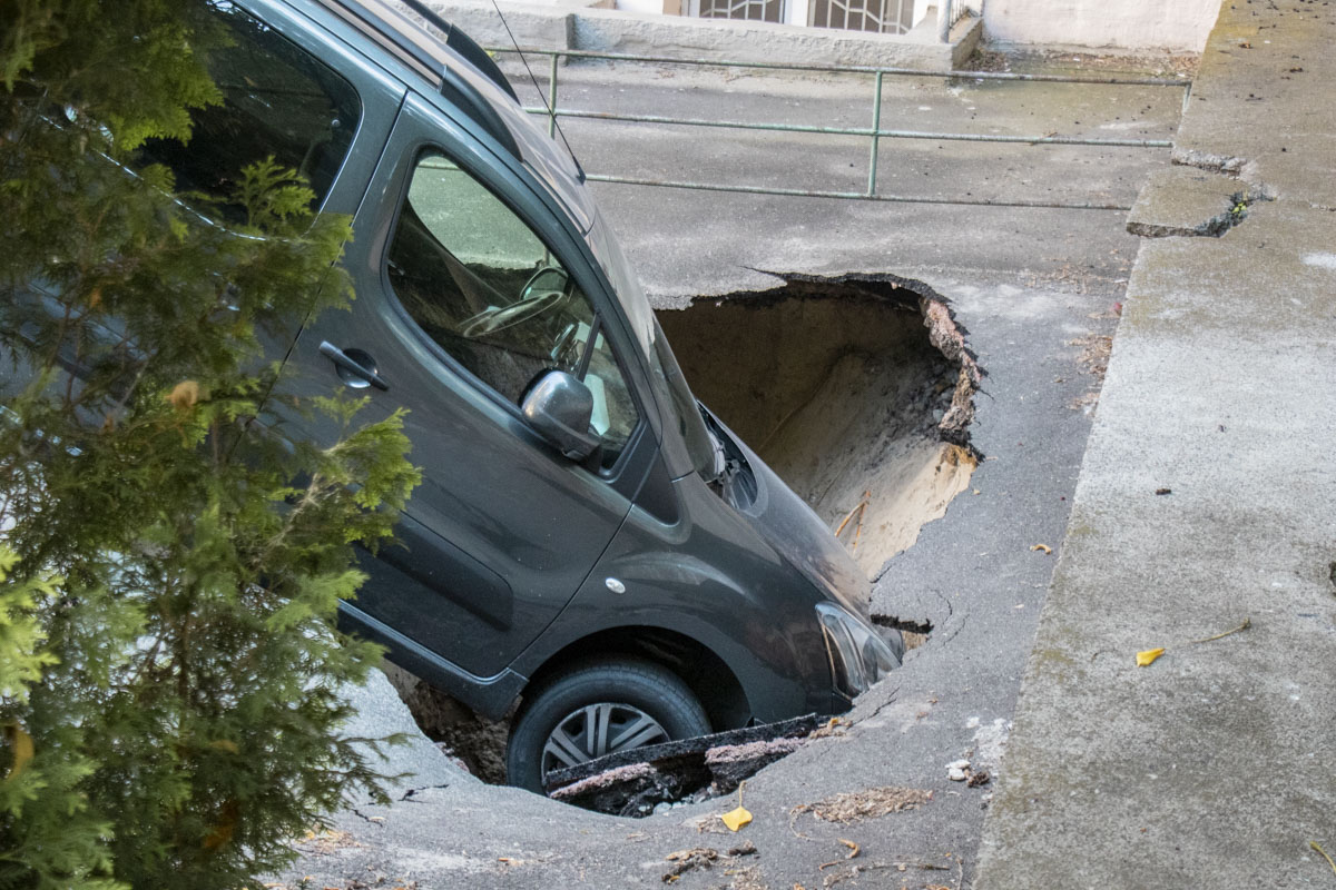 Инцидент произошел на улице Крещатик, 4, во дворе жилого дома. В момент происшествия на месте обвала стояли два автомобиля, но водитель второго успел выехать и не попал под раздачу. Первая же машина упала вместе с асфальтом в глубокую яму и наполовину оказалась под землей.