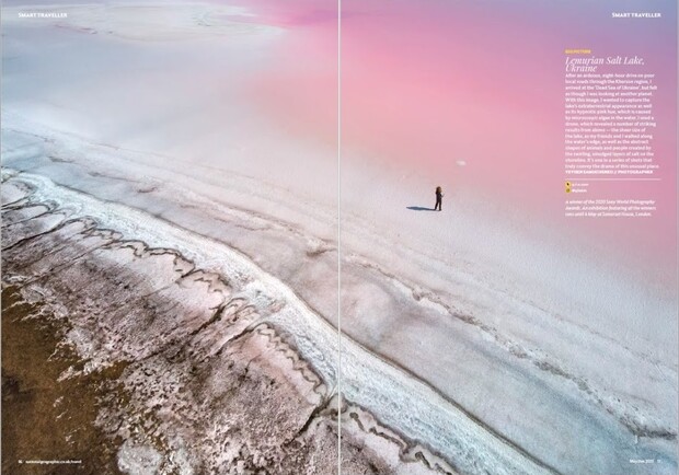 Как сообщает "Культурометр", изображение соляного озера в Херсонской области из серии "На розовой планете" разместили в майском номере журнала.