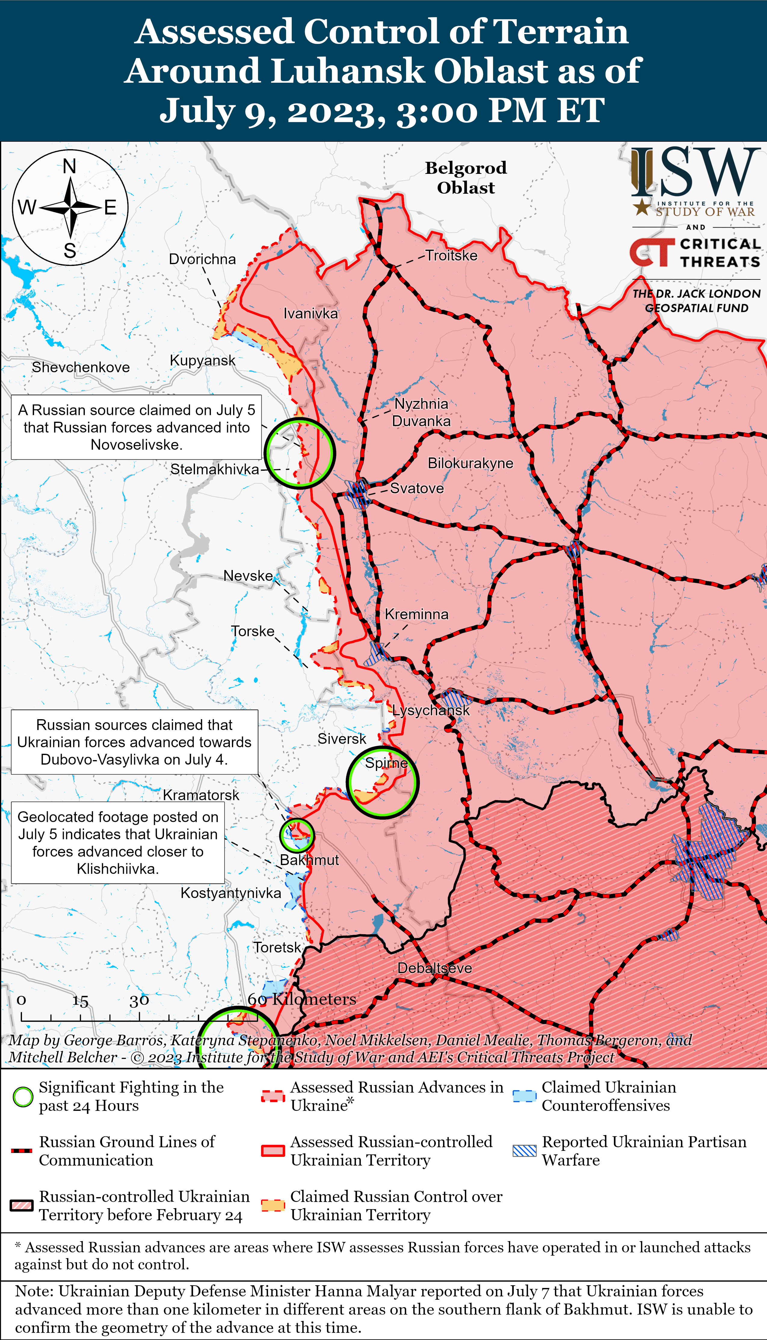 Российские и украинские силы продолжали наземные атаки на линии города Авдеевка-Донецк, и российские войска продвинулись по состоянию на 9 июля. Геолокационные кадры показывают, что они совершили незначительное продвижение к юго-западу от Веселого.