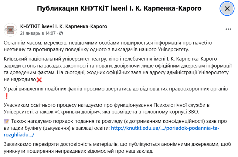 Это не первый секс-скандал в Университете им. Карпенко-Карого. В 2021 году преподаватель и народный артист Владимир Талашко уволился из-за обвинений студенток и абитуриенток в притязаниях, а также в обвинении в изнасиловании 17-летней дочери его друзей Марии Матрос.