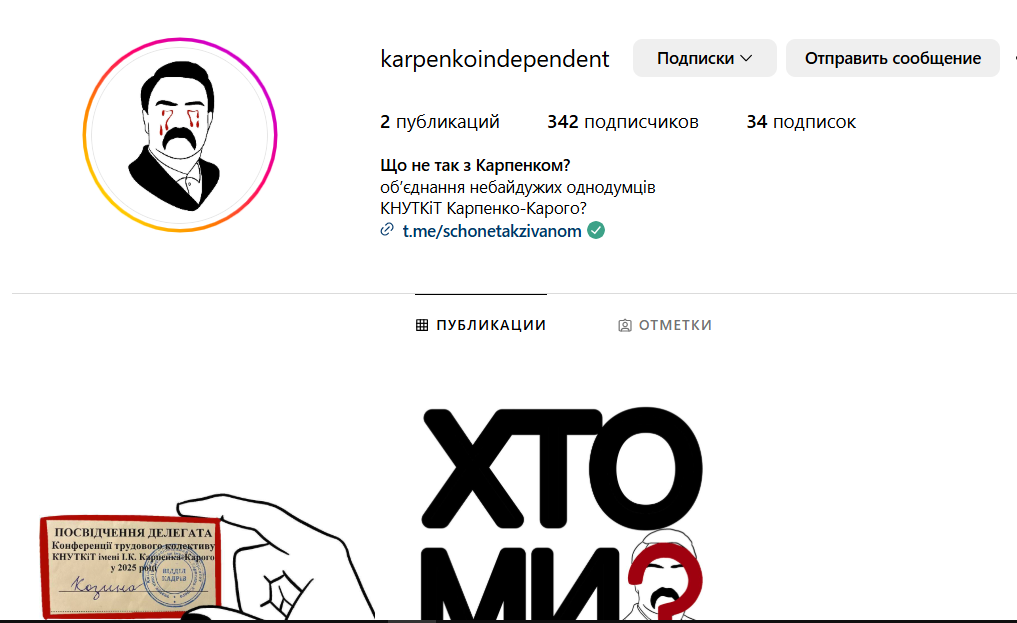 В то же время активные студенты университета создали объединение, в котором стремятся сделать университетскую жизнь более прозрачной и лучшей. Свою почицию и действия они преподают в Телеграмм-странице "Что не так с Карпенко?"