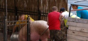 Фотофакт: хряка Вещуна тянули из клетки за хвост с ведром на голове