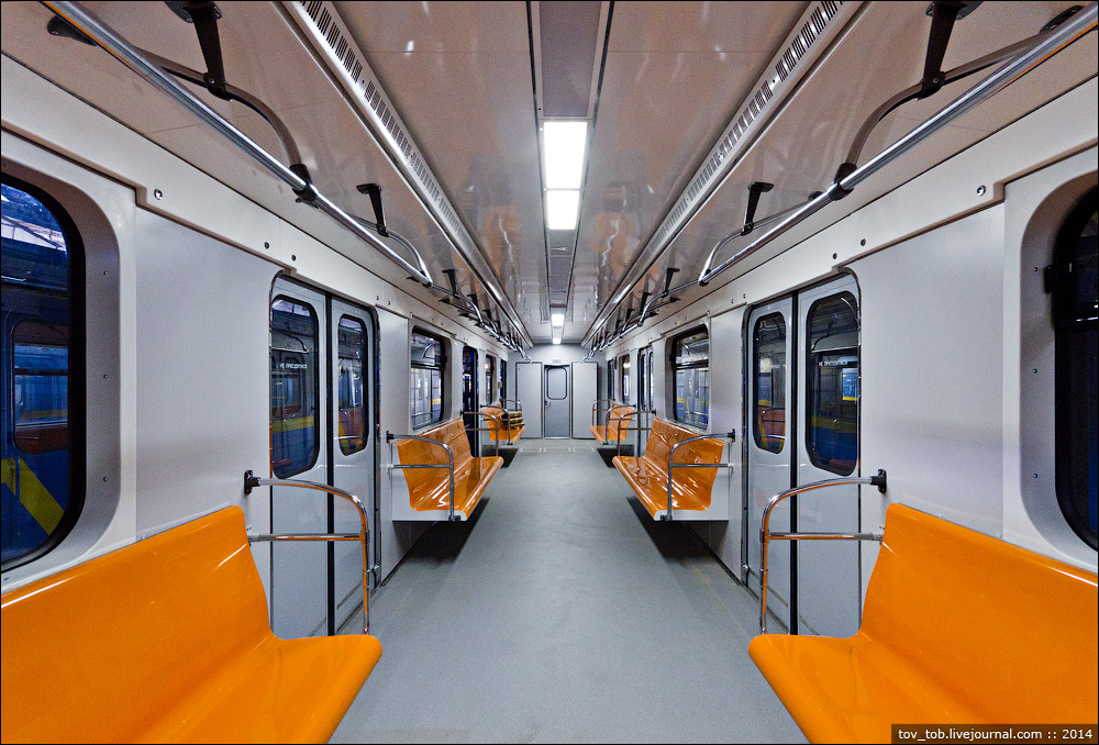 Один из таких составов - на Сырецко-Печерской линии метрополитена. По словам пассажиров, камер наблюдения в вагоне две: они установлены над дверями в торцевой части.