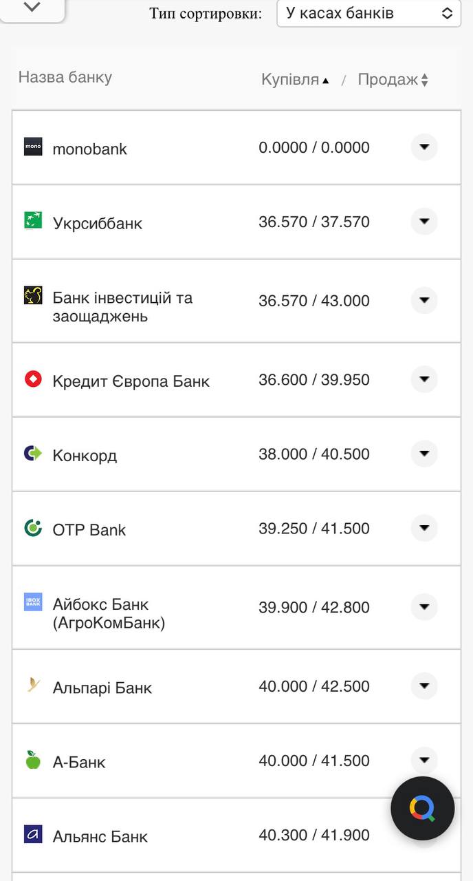 Курс долара США у касах банків за даними Мінфіна