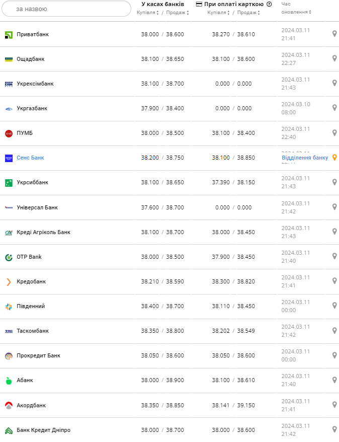 Курс долара США у касах банків та при оплаті карткою за даними Мінфіну