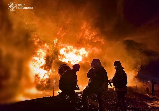 Внаслідок нічної атаки на Київську область сталася масштабна пожежа на промисловому підприємстві. Фото: ДСНС Київщини
